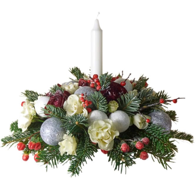 Centrotavola di Natale sulle tonalità del rosso e dell’argento, composto da rametti di Abete, Pigne, Rose rosse, Fiori bianchi, decorazioni color argento e bianche e una grande Candela per scaldare subito l’atmosfera in casa.